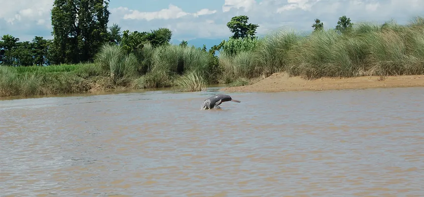 Ganges River dolphins prefer deep, slow-moving waters and are often found in river confluences, meandering rivers, and open rivers. They typically inhabit depths between 3 to 5 meters but can adapt to as low as 2 meters. The distribution and population of dolphins in the Karnali and Geruwa rivers vary seasonally, heavily influenced by water depth and flow . Floods, such as the one in 2009, can significantly alter dolphin habitats by changing river depths through sediment deposition. Dolphin observation is easier in smaller rivers like the Kandra, Kanda, Pathraiya, and Mohana, where they migrate during monsoon seasons when water levels rise. These smaller rivers provide slower-moving waters, making it easier to spot dolphins and their young.